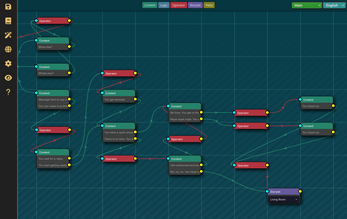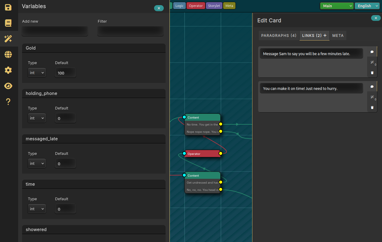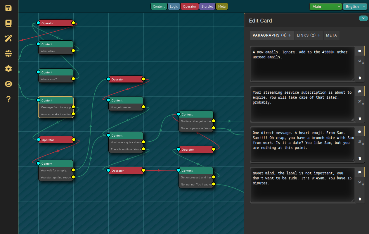 Tvain-B is a node-and-noodle editor for interactive fiction and branching narratives. You build stories by placing cards on a canvas and connecting them with links. The result is a single JSON file that can be consumed by any runtime that implements the Tvain format.